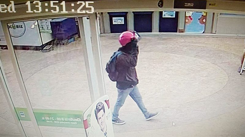 Witnesses described the suspect as 155-160 centimetres tall, slim and wearing a dark jacket, jeans and sneakers, black gloves, a purple motorcycle helmet and a blue backpack.