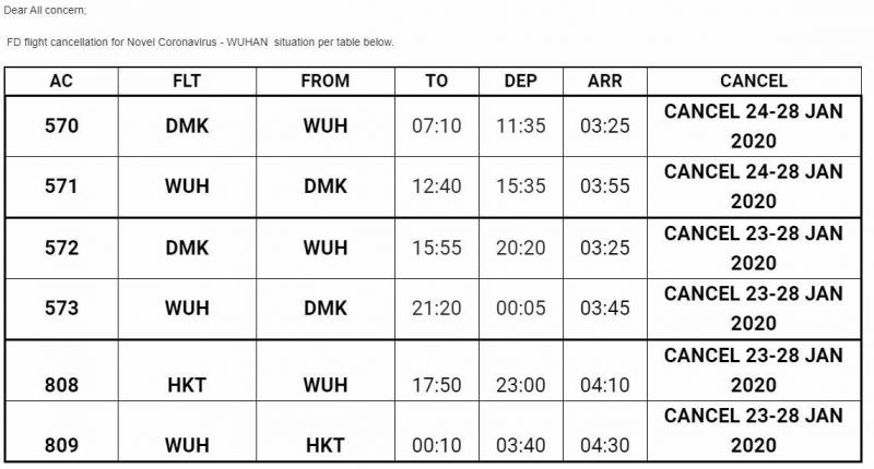However, six flights of Thai AirAsia scheduled to fly to and from Wuhan city to Don Mueang and Phuket airports during January 23-28 have all been cancelled.