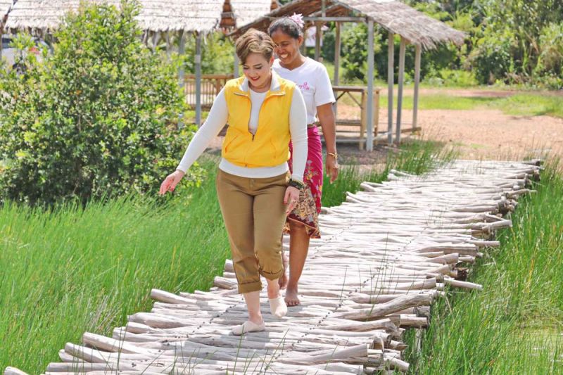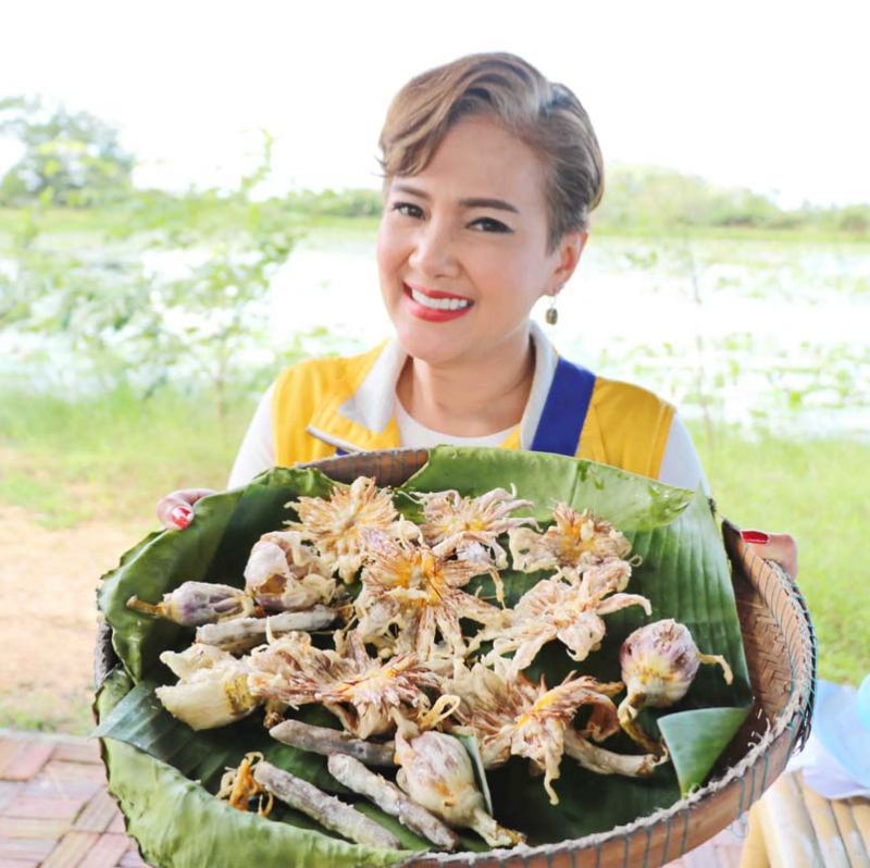 ส่วนคุณน้ำผึ้งก็ขอชิลๆ อยู่ไม่ไกล เดินสะพานไม้เหม็ดนวดฝาเท้า ชมตลาดของชุมชน นั่งจิบชาจากสายบัว ต่อด้วยโชว์ฝีมือแม่ศรีเรือนทำดอกบัวทอดกรอบ งานนี้ She มีแอบดัดแปลงรูปร่างดอกบัวทอดซะด้วย..!!