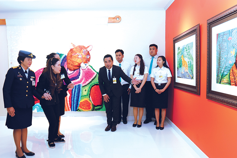 โอกาสนี้ ได้เสด็จฯทอดพระเนตรนิทรรศการวิทยานิพนธ์ ภาพวาดฝีพระหัตถ์ ชุด “หลากลาย หลายชีวิต 2” (Various Patterns; Diversity of Life 2) โดยแบ่งออกเป็น 9 กลุ่มของผลงานตามเนื้อหาสาระ ได้แก่ กลุ่มที่ 1 อัตลักษณ์ของเสือ กลุ่มที่ 2 เสือกับธรรมชาติการจัดวาง กลุ่มที่ 3 เสือกับลายเส้นและภาพขาว-ดำ กลุ่มที่ 4 เสือสัญลักษณ์ทางวิทยาศาสตร์ กลุ่มที่ 5 เสือกับจินตนาการสร้างสรรค์ กลุ่มที่ 6 เสือ ดอกไม้ และสิ่งมีชีวิตต่างๆ กลุ่มที่ 7 นกฮูกกับสัตว์มีปีก กลุ่มที่ 8 จิตรกรรมฝีพระหัตถ์ในเทคนิคภาพพิมพ์ กลุ่มที่ 9ศิลปกรรมฝีพระหัตถ์ในกระบวนการอื่นๆ