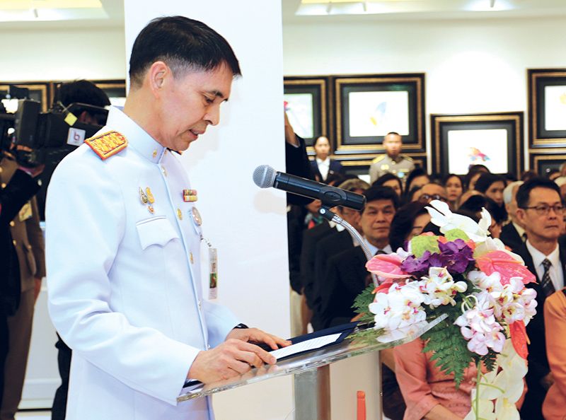 จากนั้น ศาสตราจารย์ ญาณวิทย์ กุญแจทอง คณบดีคณะจิตรกรรมประติมากรรม และภาพพิมพ์ มหาวิทยาลัยศิลปากร ถวายสูจิบัตร ศาสตราจารย์ นายแพทย์นิธิ มหานนท์ เลขาธิการราชวิทยาลัยจุฬาภรณ์ ถวายรายงานการจัดแสดงนิทรรศการวิทยานิพนธ์ ภาพวาดฝีพระหัตถ์ ชุด “หลากลาย หลายชีวิต 2 ” (Various Patterns; Diversity of Life 2) ถัดมา นายภราเดช พยัฆวิเชียร นายกสภามหาวิทยาลัยศิลปากร กราบทูลสรุปผลการสอบจบวิทยานิพนธ์ปริญญาดุษฎีบัณฑิตอย่างเป็นทางการ