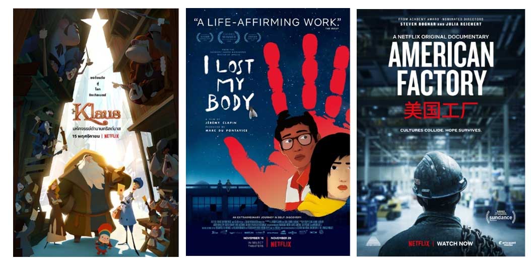 ส่วนอีก 4 คอนเทนต์บน Netflix ที่ได้เข้าชิง ได้แก่ Klaus อนิเมชันดูง่ายเหมาะกับทุกเพศทุกวัยแต่แฝงไปด้วยความลึกซึ้งในการนำเสนอตำนานคริสมาสต์ในรูปแบบที่แปลกใหม่และโดดเด่นจนมีชื่อเข้าชิงในสาขา Animated Feature Film เช่นเดียวกับ I Lost My Body อนิเมชันจากประเทศฝรั่งเศสที่เล่าเรื่องราวของ ’มือขวา’ ที่กลับมามีชีวิตและหนีจากตู้แช่แข็งในห้องแล็บโรงพยาบาล ออกผจญภัยในเมืองปารีส เพื่อตามหาร่างที่หายไป ส่วนสารคดีของ Netflix ก็ร่วมเข้าชิงในสาขา Documentary (Short Subject) กับสารคดี 2 เรื่องอย่าง ที่ Life Overtakes Me ที่ถ่ายทอดชีวิตของพ่อแม่ที่ต้องทนทุกข์ทรมานขณะดูแลลูกที่กำลังป่วยอย่างใกล้ชิด และ American Factory ที่บอกเล่าเรื่องราวของบริษัทจีนในอเมริกาซึ่งสะท้อนความขัดแย้งทางวัฒนธรรมที่อาจทำลายความฝันของอเมริกันชน