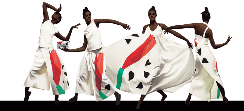 The fabric is used in abundance to convey the gentle, laid-back image of Tanaka’s plants, and the bold placement of the motifs results in a collection that creates a scene in which the wearers become flowers swaying in the wind.