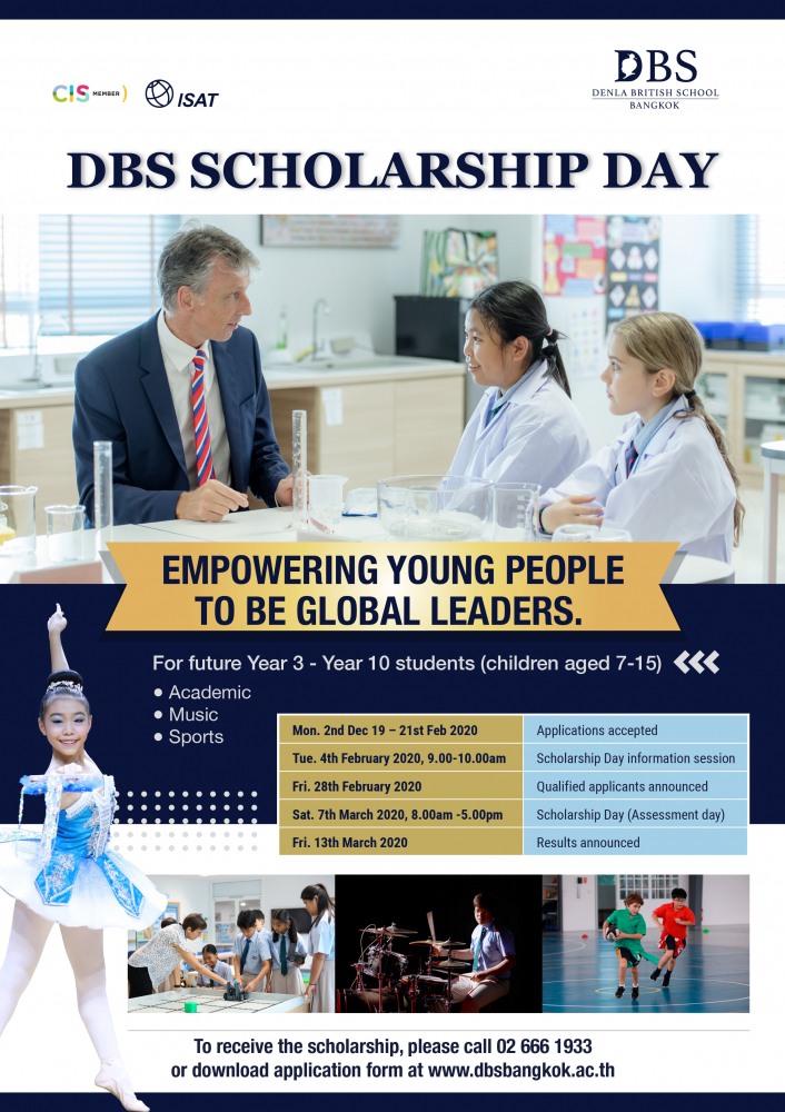 The opportunity to become part of the Denla British School (DBS) family is here for Year 3 to Year 10 students who excel in Mathematics, Science, English, Thai, Music, Sport, and all-round abilities! Denla British School (DBS) is a premium international school that implements the Enhanced British Curriculum modelled on the top independent schools in the UK, and it offers scholarship opportunities at the “DBS Scholarship Day” for students of Year 3 to Year 10. Interested students and parents can learn more about this at the scholarship information session at DBS on Tuesday 4th February 2020 from 9.00-10.00 am. Then, on Saturday 7th March 2020, selected candidates will be invited to take the scholarship assessment at DBS.