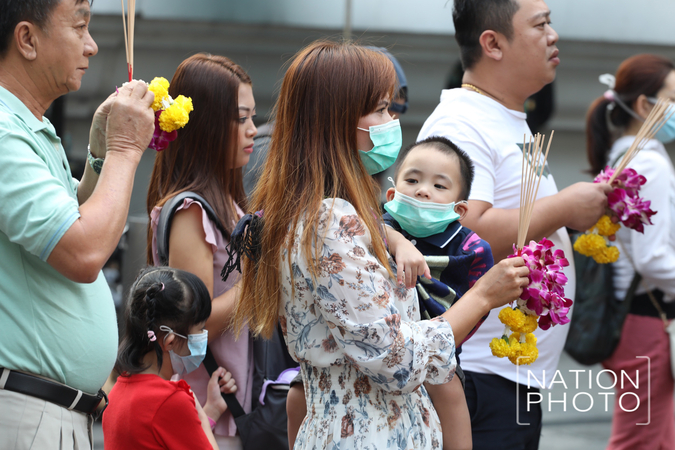 Foreign tourists pay their respects at the Erawan Shrine and shopping in the Ratchaprasong area on Sunday (February 2) wearing masks to protect themselves from the new coronavirus. The number of tourists has seen a huge fall as a result of measures by China prohibiting tour companies from taking people out of the country. Most of the remaining tourists travel in small groups or are those who have stayed behind after China closed entries and exits to many of its cities.
