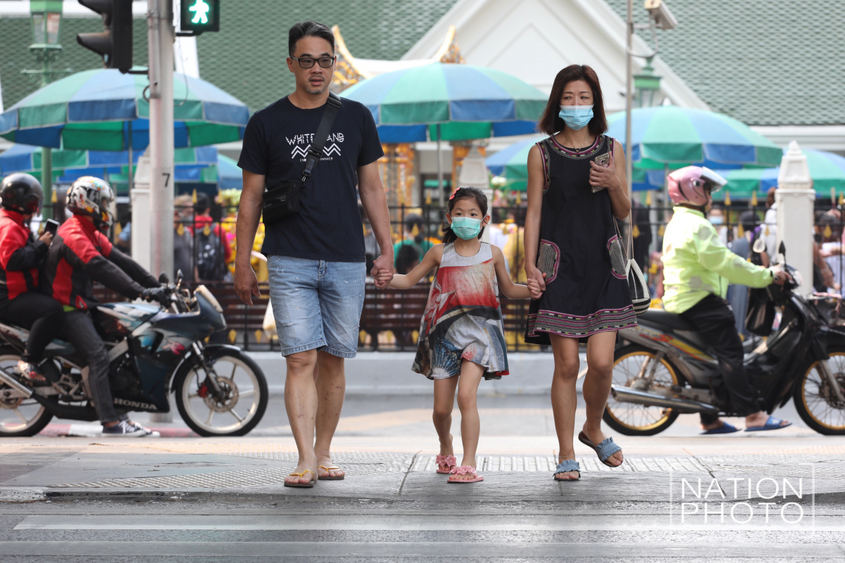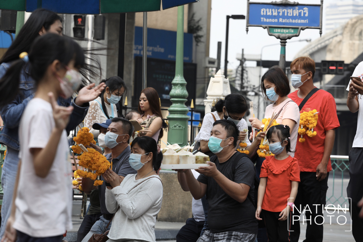 Foreign tourists pay their respects at the Erawan Shrine and shopping in the Ratchaprasong area on Sunday (February 2) wearing masks to protect themselves from the new coronavirus. The number of tourists has seen a huge fall as a result of measures by China prohibiting tour companies from taking people out of the country. Most of the remaining tourists travel in small groups or are those who have stayed behind after China closed entries and exits to many of its cities.
