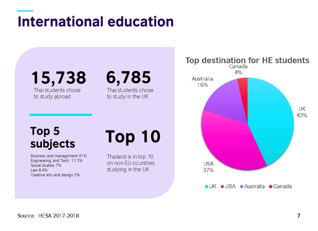 The top five subjects Thai students choose to study in the UK are business and management at 41 per cent, engineering and technology 11.5 per cent, social studies 7 per cent, law 6.4 per cent, and creative arts and design 5 per cent, the council added.