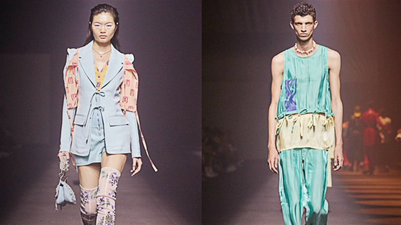 For women, neoprene suits in orange, violet and black are juxtaposed against crushed wet-look jersey tops and dresses. Skirts in mermaid jacquard linens are adorned with pearl buttons while nylon tops in vivid colours of corals have sleeves rolled up to the shoulder. Transparent suiting complements the prints of shrimp, mermaids and sea lilies. High-waisted trousers feature an assembly of embroideries, reminiscent of treasures amassed while diving. Woven ikats feature on either dress, tops for women or as panelling on shirts and trousers for men. Tailoring in liquid viscose, sun-bleached denim and ikat prints also straddle both collections.