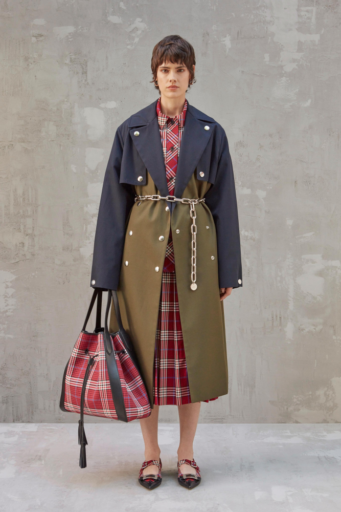 The colour palette sees Mulberry’s classic British navies, oaks and oxblood reinvigorated with porcelain blue, scarlet and flashes of firefly yellow. Applied in alternate blocks, the colours also become a motif: contrasting seams are used to delineate the body and highlight the garment’s construction.