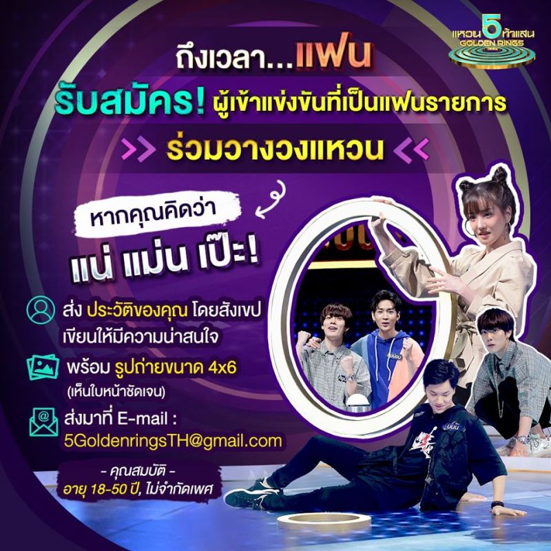 ห้ามพลาด! ติดตามชมความสนุกได้ในรายการ “แหวน 5 ท้าแสน 5GOLDEN RINGS” ออกอากาศวันจันทร์ที่ 17กุมภาพันธ์ – วันอังคารที่ 18กุมภาพันธ์2563เวลา 18.00 น. ทางช่อง 7HD หมายเลข 35