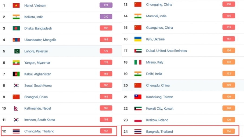 The air situation is much worse in Chiang Mai, with average pollution level of 157, making it the 12th worst city for air quality.