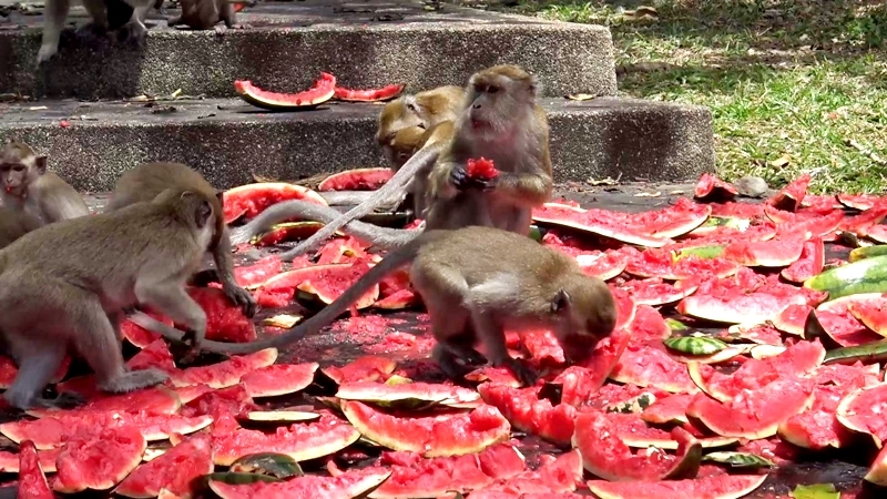 After seeing the monkeys starve, local fruit vendors have started giving them watermelon and tomatoes. Thai tourists meanwhile are giving them corn.