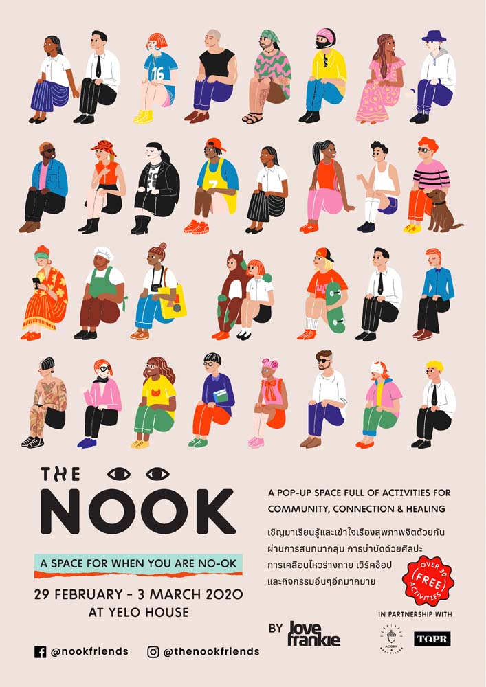 หากคุณเคยมีความรู้สึกโดดเดี่ยว คุณจะไม่โดดเดี่ยว และหากคุณรู้สึกโอเค นั่นเป็นสิ่งที่โอเคเช่นเดียวกัน สำหรับผู้ที่มีคำถาม หรือความคิดความรู้สึกที่อยากแสงออกเกี่ยวกับสุขภาพจิต เดอะนุก (The Nook) เปิดตัวพื้นที่กิจกรรมป๊อปอัพสุขภาพจิต ณ Yelo House พื้นที่ที่เปิดต้อนรับคุณเมื่อรู้สึก No(t) OK ระหว่างนี้จนถึงวันที่ 4 มีนาคม 2563