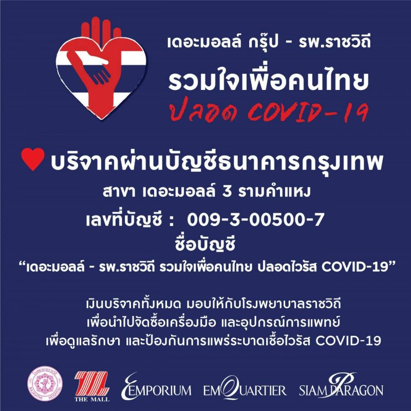 บริษัทเดอะมอลล์ กรุ๊ป จำกัด ขอเชิญชวนคนไทยทุกคน ร่วมกันบริจาคเงินสมทบทุนการซื้ออุปกรณ์การแพทย์ที่มีความจำเป็น โดยเงินรายทั้งหมดจะมอบให้แก่โรงพยาบาลราชวิถี เพื่อผ่านพ้นวิกฤตไวรัสโควิด -19 โดยเร็วที่สุด อีกทั้งเดอะมอลล์กรุ๊ป ขอให้คำมั่นสัญญาว่าจะร่วมยืนหยัดเคียงข้างคนไทยทุกคนในการดำเนินการเพื่อให้ประเทศไทยและทุกประเทศทั่วโลกปลอดไวรัสโควิด-19ผู้มีจิตศรัทธาสามารถติดตามรายละเอียดเพิ่มเติมได้ที่ เฟชบุ๊ค THE MALLTHAILAND