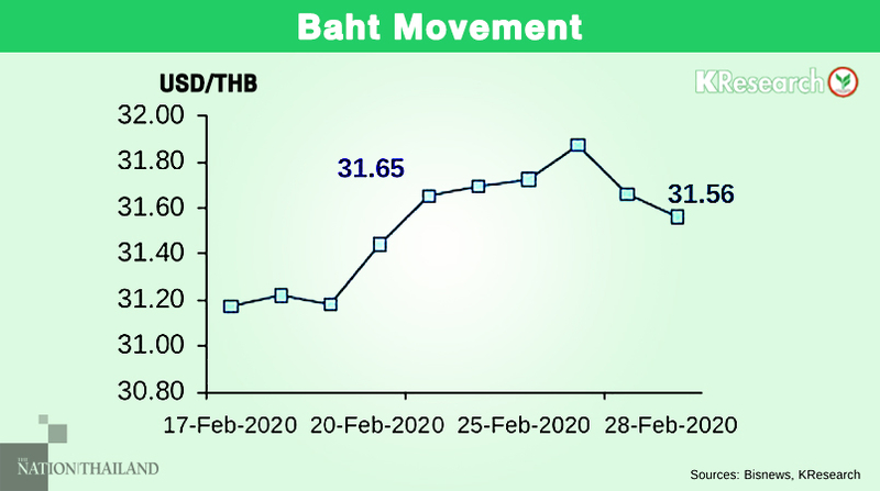 Last week ,Kasikorn Research Centre said the baht had rebounded later in the week, having recouped losses during early to mid-week, after the Thai currency weakened in line with other regional currencies amid growing concerns about the Covid-19 outbreak outside China.