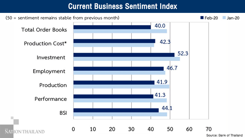 The deteriorating confidence was common among respondents in both manufacturing and non- manufacturing sectors, as well as in almost all sub-indices, especially order books, production and performance, while the three-month expected BSI decreased from the previous month to 50.5 due mainly to concern over the Covid-19 coronavirus.