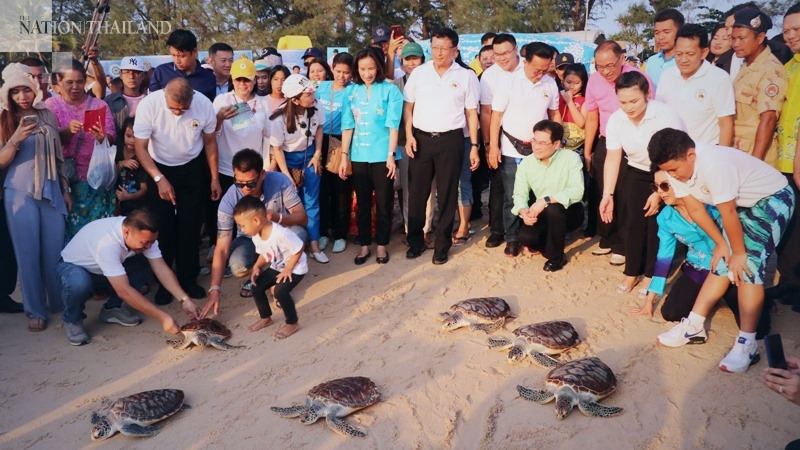 Commerce Minister Jurin Laksanawisit recently led the release of green turtles to the sea under a conservation programme at Thai Muang Beach in Thai Muang district of Phang-nga province.