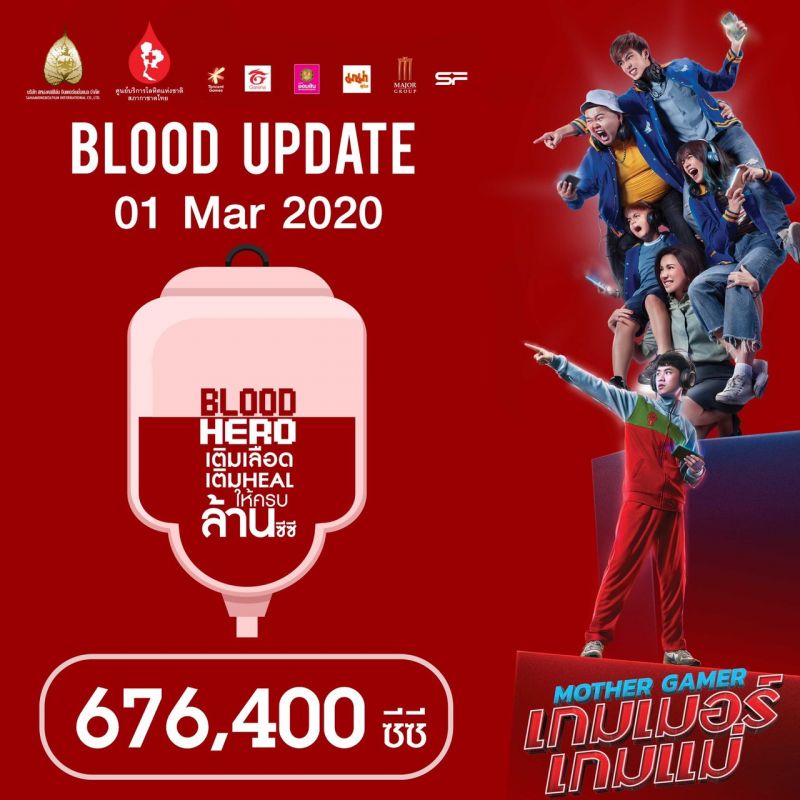 หลังจากเปิดโครงการ“BLOOD HERO vs เกมเมอร์เกมแม่ เติมเลือด เติม Heal ให้ครบล้านซีซี” ในโอกาสครบรอบการก่อตั้งบริษัทครบ50ปี ของบริษัท สหมงคลฟิล์ม อินเตอร์เนชั่นแนล จำกัด ซึ่งร่วมมือกับศูนย์บริการโลหิตแห่งชาติ สภากาชาดไทย พร้อมด้วย Tencent Gamesและ Garena Thailand โดยการสนับสนุนจากธนาคารออมสิน และผลิตภัณฑ์บะหมี่กึ่งสำเร็จรูปตรา มาม่าโดยมีผู้สนใจเข้าร่วมกิจกรรมบริจาคเลือดอย่างต่อเนื่อง