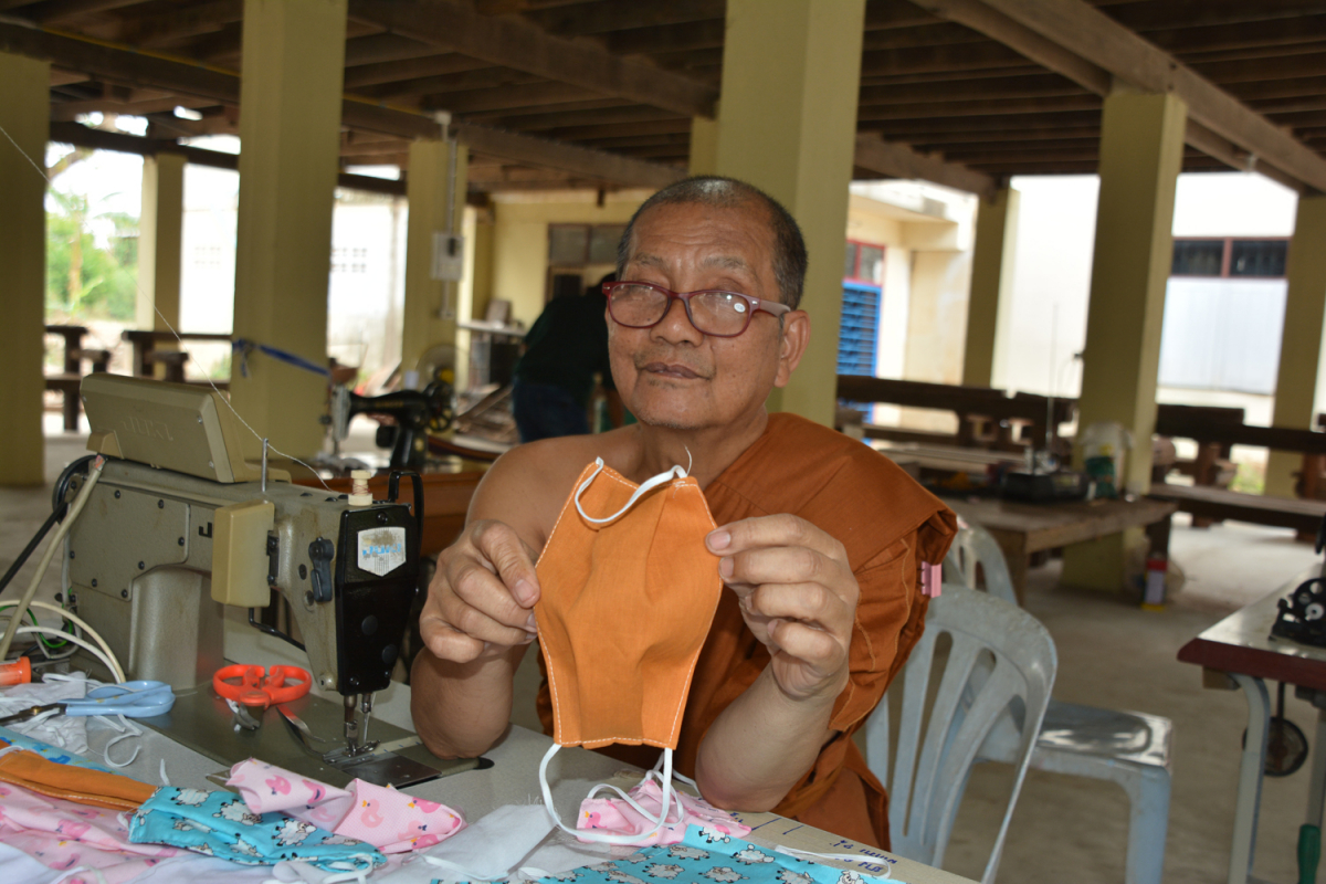 “Facemasks are selling for high prices and they’re hard to come by in rural areas,” he said. “That’s why I started making them for the other monks and the novices, using fabric from old clothes, and I give them away to people who come here to make merit.”