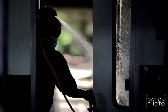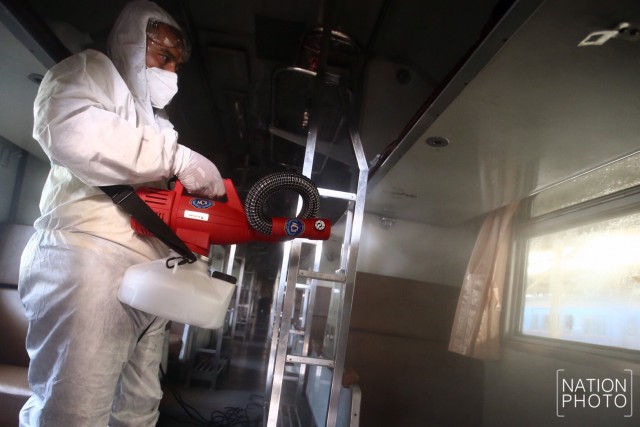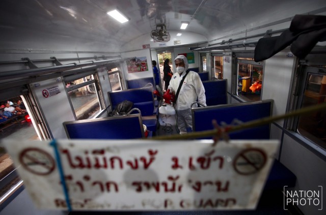 A hive of people on the move, both Thais and foreigners, the station is being sprayed with disinfectant inside, with extra attention paid to the most frequently touched surfaces, such as ticket offices, passenger seats and washrooms.