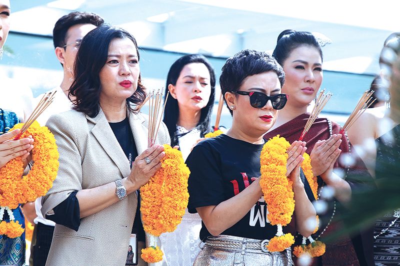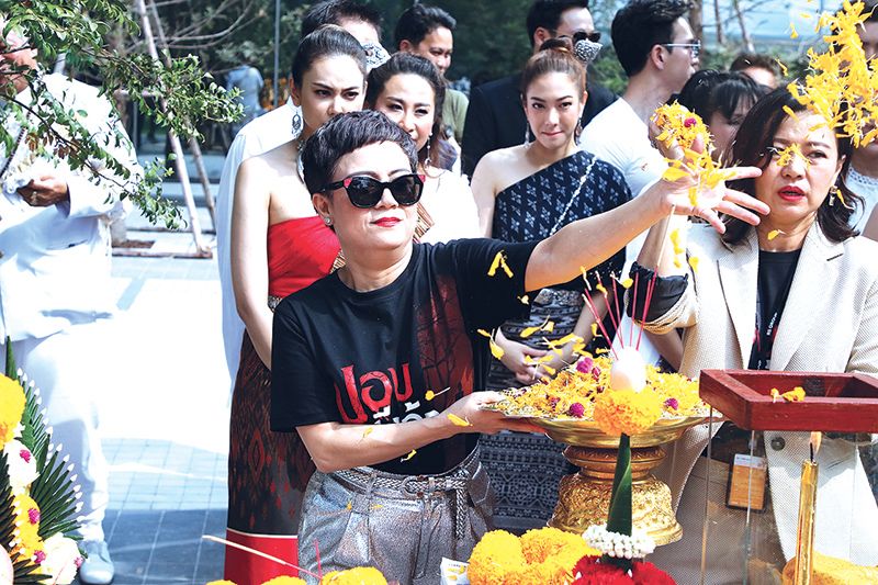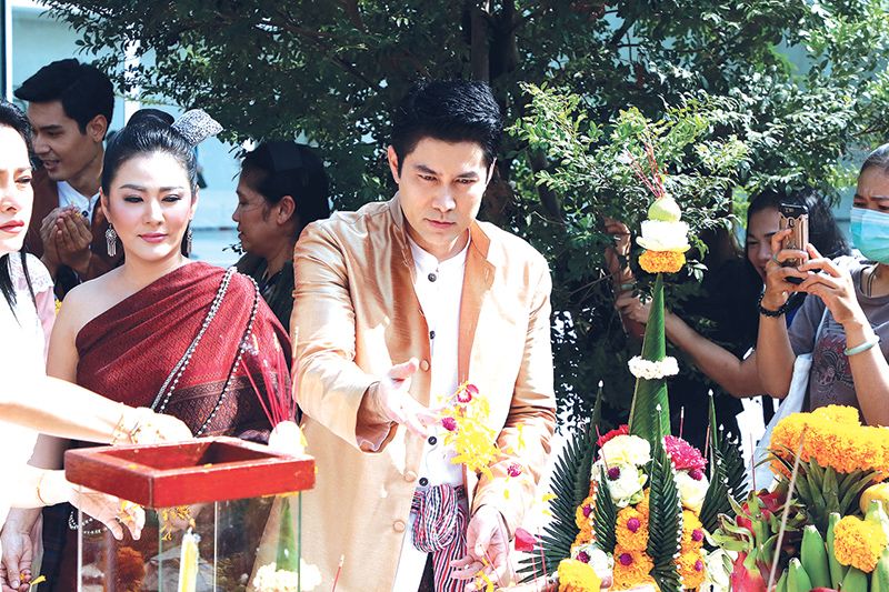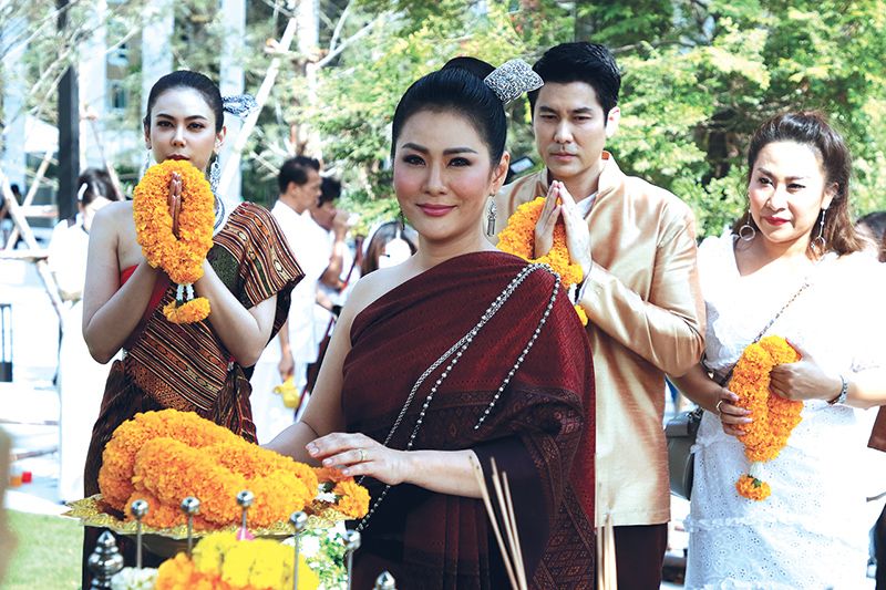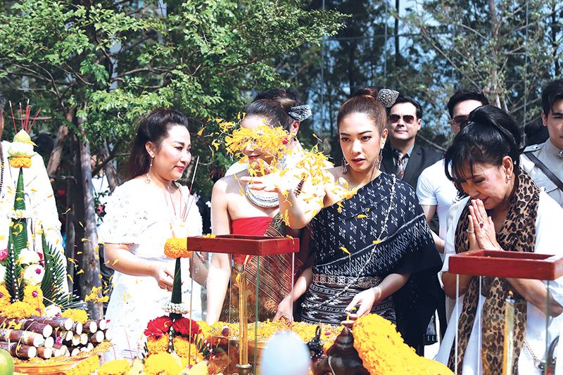 บรรยากาศในงานเต็มไปด้วยกองทัพสื่อมวลชน ที่มารอเก็บภาพกันแต่เช้า ถึงเวลาฤกษ์ดีเหล่านักแสดงเริ่มทยอยลงมาที่ลานพิธี งานนี้สื่อมวลชนต่างรัวชัตเตอร์กันแทบไม่ทัน เพราะเปิดด้วยเซตนักแสดง นำทีมโดย น้ำผึ้ง-ณัฐริกา ธรรมปรีดานันท์ ที่ควงหนุ่มสมาร์ท-กฤษฎาพรเวโรจน์ เรียกได้ว่าเป็นเคมีที่เข้ากันสุดๆ แถมได้เสียงเรียกจากบรรดาสื่อมวลชน ที่รุมล้อมขอถ่ายภาพกันรัวๆ พร้อมด้วย 5 สาวงามแห่งเวียงผาจันทร์ มาในชุดผ้าซิ่นโบราณสะกดตา นำทีมตัวแม่อย่าง ตอง-ภัครมัย โปตระนันทน์ ตามมาติดๆ ด้วย สาวฝ้าย-เวฬุรีย์ ดิษยบุตร, แป้ง-อรจิรา แหลมวิไล และ จูน-ชลฤดี อมรลักษณ์ รวมกลุ่มกันทยอยเดินออกมาให้สื่อมวลชนรัวถ่ายรูปกัน เสริมทัพด้วยนักแสดงมากฝีมือ