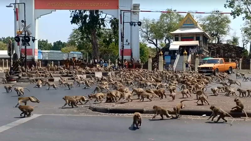 Hundreds of monkeys staged a fight for drinking yogurts near the San Phra Kan Shrine in Lopburi province today (March 11) ,with traffics coming to a halt amid the unruly scene, which some described as terrifying.