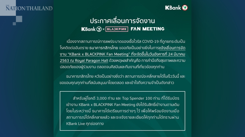 Kasikornbank has postponed the KBank x BLACKPINK Fan Meeting event, scheduled for March 24 at Royal Paragon Hall, due to fears of Covid-19 infection among performing artists and visitors.