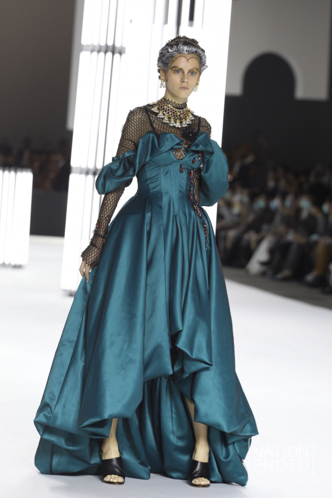 “That was a key look from the ‘Presence of The Past’ collection in 2008 and it was redesigned by using ivory-toned silk chiffon sewn into a short shirt at the shoulders and modern puffed sleeves.”