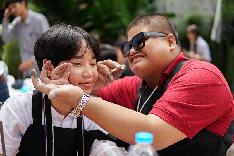 “ผู้พิการทางสายตาจะเปิดจินตนาการและรับรู้ความสวยงามได้จากการสัมผัส ครั้งนี้เราจึงลองนำงานปั้นเข้ามาเพื่อให้ได้สัมผัสพื้นผิวที่เยอะขึ้น เขาจะได้รู้สึกและเห็นภาพผลงานของตัวเองได้ผ่านการสัมผัสรูปทรงตรงหน้า โดยการปั้นดินไม่ได้ปั้นเป็นวัตถุใช้สอย แต่เราให้น้องๆ ปั้นใบหน้าของพี่ๆ จิตอาสา เพื่อให้เขามีกระบวนการทำงานเชื่อมโยงกัน โดยมีการสัมผัสว่า ตา จมูก ปาก หู อยู่ตำแหน่งไหนรูปลักษณ์เป็นอย่างไร แล้วน้องๆ ก็จะปั้นตามจินตนาการที่ได้สัมผัส โดยมีพี่ๆ จิตอาสาคอยช่วยเหลือและแนะนำตำแหน่งของอวัยวะต่างๆ บนใบหน้า ซึ่งในกระบวนการทำงานร่วมกันนั้นเต็มไปด้วยความอบอุ่นและรอยยิ้มระหว่างพี่อาสาและผู้พิการทางสายตา”