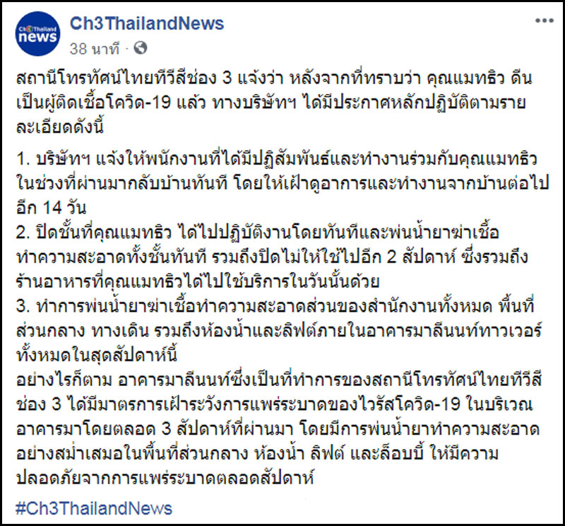 13 มีนาคม 2563 เพจเฟซบุ๊ก Ch3ThailandNews ช่อง 3 แจ้งว่า หลังจากที่ทราบว่า คุณแมทธิว ดีน เป็นผู้ติดเชื้อโควิด-19 แล้ว ทางบริษัทฯ ได้มีประกาศหลักปฏิบัติตามรายละเอียดดังนี้