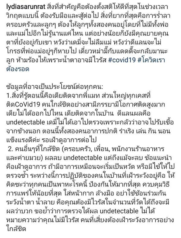 16 มี.ค.63 นักร้องสาว ลีเดีย ศรัณย์รัชต์ โพสต์ติดเชื้อโควิด-19 หลัง แมทธิว ดีน สามีโควิด ไปเมื่อ 13 มี.ค. โดยเจ้าตัวได้ระบุถึงกรณีที่ติดโควิด-19 ลงอินสตาแกรมส่วนตัว