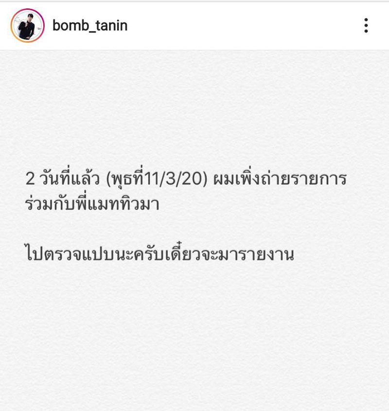 รวมทั้ง พระเอกหนุ่ม “บอม ธนิน” ได้โพสต์ข้อความผ่านทางอินสตาแกรมเนื่องจากคาดว่าอยู่ในกลุ่มคนที่เสี่ยงติดเชื้อ เพราะเพิ่งถ่ายรายการร่วมกับ แมทธิว เมื่อสองวันที่ผ่านมานี้ จึงขอเดินทางไปตรวจให้แน่ชัดในทันที “2 วันที่แล้ว (พุธที่ 11/3/20) ผมเพิ่งถ่ายรายการกับพี่แมทธิวมา ไปตรวจแป๊บนะครับเดี๋ยวจะมารายงาน”