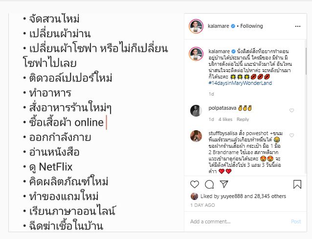 สมกับเป็นเจ้าแม่คิดบวก ที่เป้าหมายในการดำเนินชีวิตสะจริง ๆนะคะ สำหรับพิธีกรมากฝีมือ ผู้เป็นไอดอลในการใช้ชีวิตให้ใครหลาย ๆคน อย่าง กาละแมร์ – พัชรศรี เบญจมาศที่แม้ว่าตอนนี้จะต้องกักตัวเพราะเจ้า COVID-19แต่เธอก็ Don’t care จ้า แต่งตัวสวย ๆอยู่ห้องพร้อมเผยกิจกรรมกักตัวอย่างสร้างสรรค์ผ่านIG ส่วนตัว @kalamare ไม่ว่าจะเป็นการดูแลตัวเอง พักผ่อนนอนดูซีรีส์ แผนการรีโนเวทห้องสุดหรู แต่กิจกรรมที่ดูสะดุดตาสุดก็คือ การโชว์ผลิตภัณฑ์น้องใหม่BETTER MILK นมอัลมอนด์ และการจัดโปรโมชั่นแต่ละแบรนด์ที่อยู่ในมือ เพื่อเป็นการคลายเครียดให้เหล่านักช้อปออนไลน์ เรียกได้ว่า พลิกวิกฤตเป็นโอกาส สมกับเป็นเจ้าแม่คิดบวกที่มีเป้าหมายในชีวิตไว้พุ่งชนจริง ๆ จ้า แม่ งานนี้พันล้านแค่เอื้อมแน่ ๆ