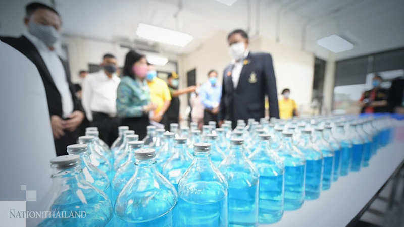 The Bangkok Metropolitan Administration assembled a mini-factory on Thursday (March 19) where people from Navamindradhiraj University and the Social Development Office produced bottled alcohol-based handwash that will be distributed 2,000 communities in Bangkok starting on Friday (March 20).
