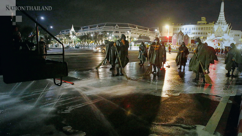 Military personnel from the 1st Division of King’s Guard regiment clean the Na Phralan Road in Bangkok’s Phra Nakhon district at dawn on Thursday (March 19) with benzalkonium chloride mixed with water to reduce the risk of Covid-19 spreading.