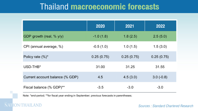 We now forecast Thai GDP growth at -1.0 per cent this year, versus +1.8 per cent previously, with Q1 growth at -3.0 per cent year on year. We expect a return to positive growth in 2021-22, but at lower levels: 1.8 per cent in 2021, compared to 2.5 per cent previously, and 2.5 per cent in 2022 from the previous projection of 5 per cent,” said Tim.