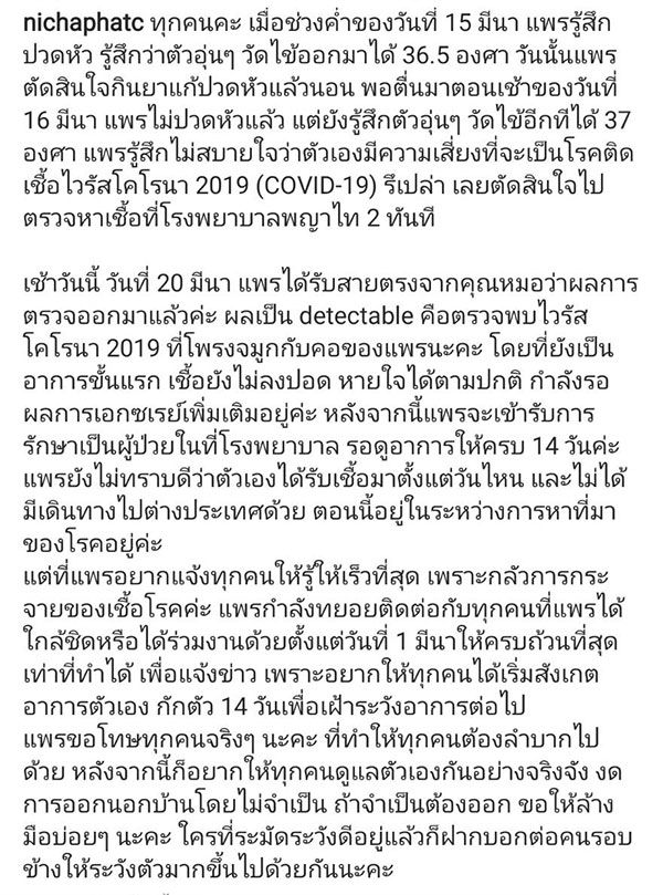 แต่ที่แพรอยากแจ้งทุกคนให้รู้ให้เร็วที่สุด เพราะกลัวการกระจายของเชื้อโรคค่ะ แพรกำลังทยอยติดต่อกับทุกคนที่แพรได้ใกล้ชิดหรือได้ร่วมงานด้วยตั้งแต่วันที่ 1 มีนาให้ครบถ้วนที่สุดเท่าที่ทำได้ เพื่อแจ้งข่าว เพราะอยากให้ทุกคนได้เริ่มสังเกตอาการตัวเอง กักตัว 14 วันเพื่อเฝ้าระวังอาการต่อไป