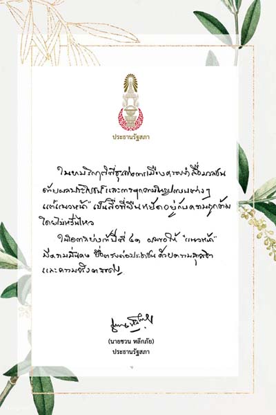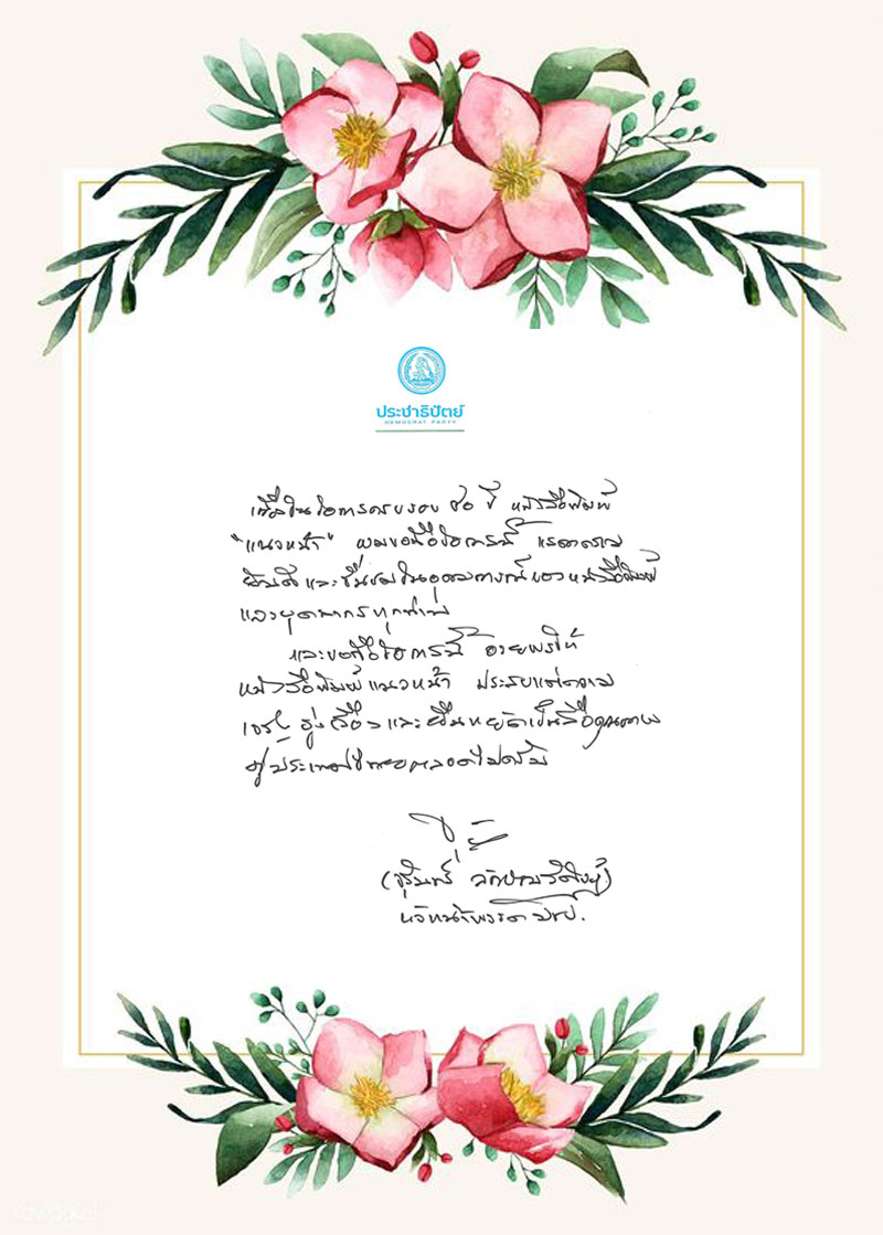 ในโอกาสนี้ ผมขอแสดงความยินดีและขออวยพรให้หนังสือพิมพ์แนวหน้า จงประสบผลสำเร็จในการดำเนินกิจการตลอดไป และขออำนวยพรให้ผู้บริหารและพนักงานทุกท่าน จงประสบแต่ความสุข ความเจริญ มีพลานามัยที่แข็งแรงสมบูรณ์ เพื่อเป็นกำลังสำคัญในการพัฒนาประเทศชาติและระบอบประชาธิปไตยของไทยให้มั่นคงตลอดไป”
