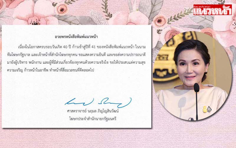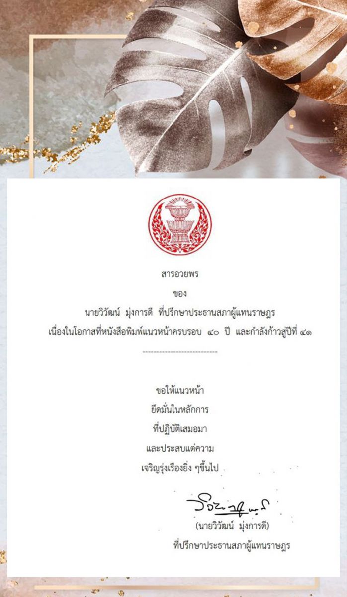 เนื่องในโอกาสก้าวเข้าสู่ปีที่ 41 ของหนังสือพิมพ์แนวหน้า ผมขออาราธนาคุณพระศรีรัตนตรัยและสิ่งศักดิ์สิทธิ์ทั้งหลาย อีกทั้งพระบารมีในพระบาทสมเด็จพระเจ้าอยู่ และสมเด็จพระนางเจ้า ฯ พระบรมราชินี โปรดดลบันดาลประทานพรให้คณะผู้บริหาร และเจ้าหน้าที่ประสบแต่ความสุข เจริญด้วยจตุรพิธพรชัย มีสุขภาพกาย สุขภาพใจ ที่สมบูรณ์แข็งแรง เพื่อร่วมกันสร้างสรรค์ประโยชน์ให้แก่สังคม”