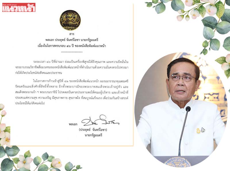 โดย พล.อ.ประยุทธ์ จันทร์โอชา นายกรัฐมนตรี มีสาส์นอวยพรถึงแนวหน้าว่า “เนื่องในโอกาสครบรอบ 40 ปี ของหนังสือพิมพ์แนวหน้า ระยะเวลา 40 ปีที่ผ่านมา ย่อมเป็นเครื่องพิสูจน์ได้ถึงคุณภาพ และความยึดมั่นในจรรยาบรรณวิชาชีพสื่อมวลชนของหนังสือพิมพ์แนวหน้าที่ดำเนินงานด้วยความมั่นคง ตรงไป ตรงมา ก่อให้เกิดประโยชน์ต่อสังคมและประชาขน ในโอกาสการก้าวเข้าสู่ปีที่ 41 ของหนังสือพิมพ์แนวหน้า ผมขออาราธนาคุณพระศรีรัตนตรัยและสิ่งศักดิ์สิทธิ์ทั้งหลาย อีกทั้งพระบารมีของพระบาทสมเต็จพระเจ้าอยู่หัวและสมเด็จพระนางเจ้าฯ พระบรมราชินี โปรดดลบันดาลประทานพรให้คณะผู้บริหาร และเจ้าหน้าที่ประสบแต่ความสุข ความเจริญ มีสุขภาพกาย สุขภาพใจ ที่สมบูรณ์แข็งแรง เพื่อร่วมกันสร้างสรรค์ประโยชน์ให้แก่สังคมต่อไป”
