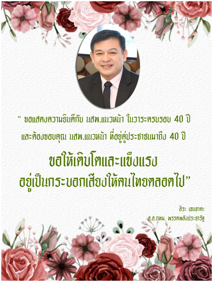นายสิระ เจนจาคะ ส.ส.กทม.พรรคพลังประชารัฐ “ขอแสดงความยินดีกับ นสพ.แนวหน้า ในวาระครบรอบ 40 ปีและต้องขอบคุณ นสพ.แนวหน้า ที่อยู่คู่ประชาชนมาถึง 40 ปี ขอให้เติบโตและแข็งแรง อยู่เป็นกระบอกเสียงให้คนไทยตลอดไป”