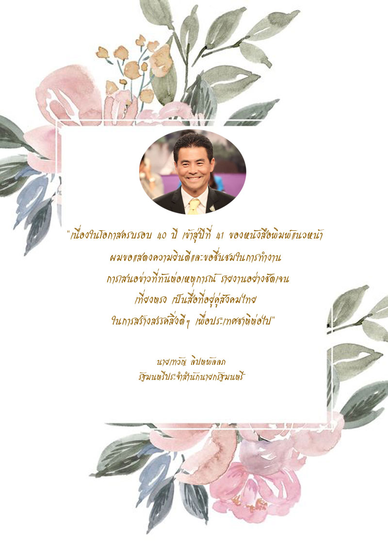 เพราะฉะนั้นในโอกาสที่ยืนอยู่ยาวนานมาถึง 40 ปีย่างเข้าสู่ปีที่ 41 นี้ผมก็อยากจะเห็นว่าสื่อมวลชนหนังสือพิมพ์แนวหน้านี้ เป็นสิ่งพิมพ์ที่จะยืนอยู่คู่กับสังคมไทยโดยเฉพาะสังคมของกรุงเทพฯ ในฐานะที่ผมเป็นประธานสภากรุงเทพมหานคร ขอให้มีความสุขความเจริญและยึดมั่น ในสิ่งที่ท่านได้ตั้งใจทำความดีเพื่อสังคมสืบไปครับ ”