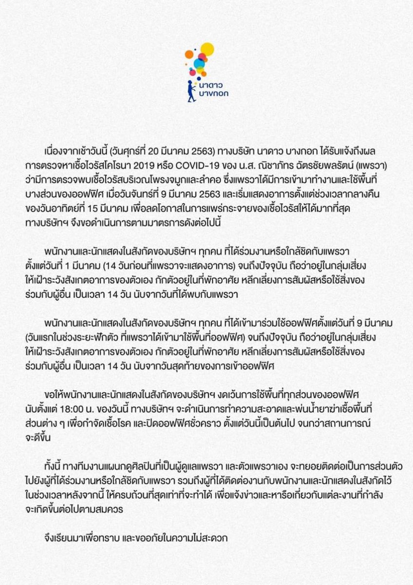 ขอให้พนักงานและนักแสดงในสังกัดของบริษัทฯ งดวันการใช้พื้นที่ทุกส่วนของออฟฟิศนับตั้งแต่ 18.00 น. ของวันนี้ ทางบริษัทฯ จะดำเนินการทำความสะอาดและพ่นน้ำยาฆ่าเชื้อพื้นที่ส่วนต่าง ๆ พื่อกำจัดเชื้อโรค และปิดออฟฟิศชั่วคราว ตั้งแต่วันนี้เป็นต้นไป จนกว่าสถานการณ์จะดีขึ้น