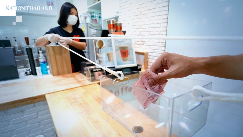“Art of Coffee” shop on the first floor of Kasetsart University’s Ngam Wong Wan parking lot is using ropes to deliver drinks to customers, in response to the need for social distance to lower the risk of Covid-19 infection.