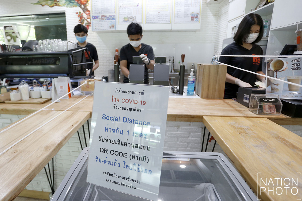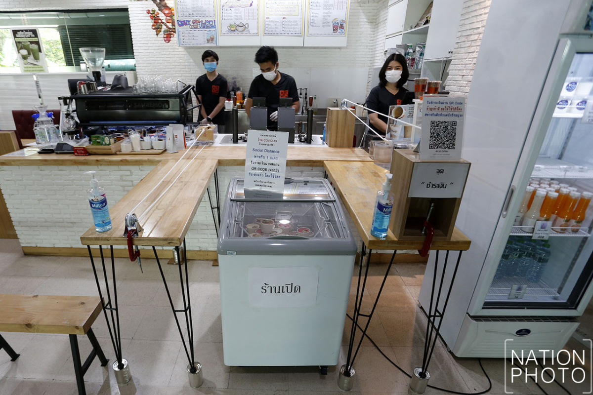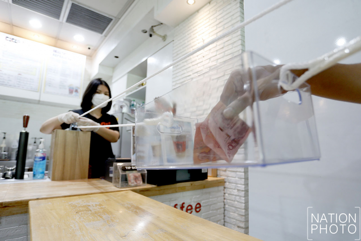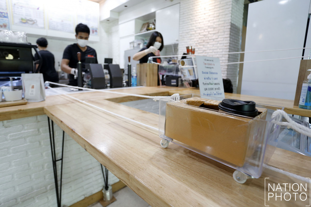 “Art of Coffee” shop on the first floor of Kasetsart University’s Ngam Wong Wan parking lot is using ropes to deliver drinks to customers, in response to the need for social distance to lower the risk of Covid-19 infection.