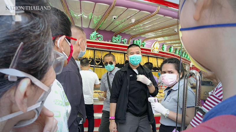 People queued at a gold shop in Bangkok’s Yaowarat area to sell their gold after the price jumped by more than Bt1,000 per baht weight this morning (March 24), compared to the price at Monday’s close.