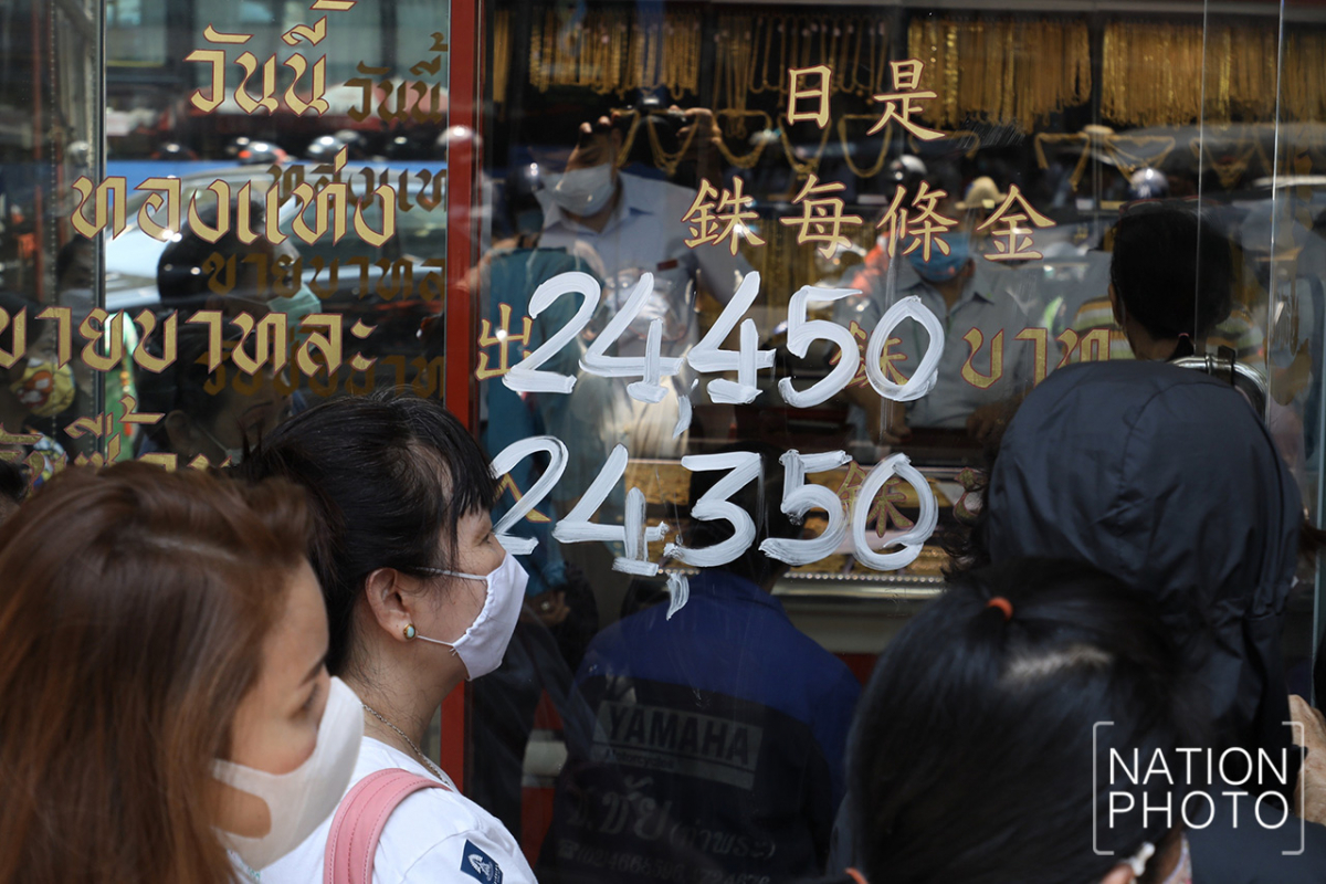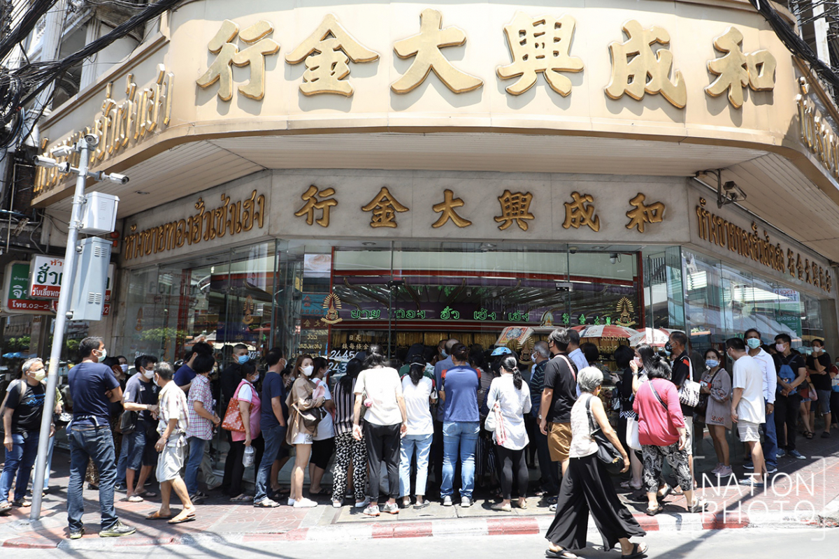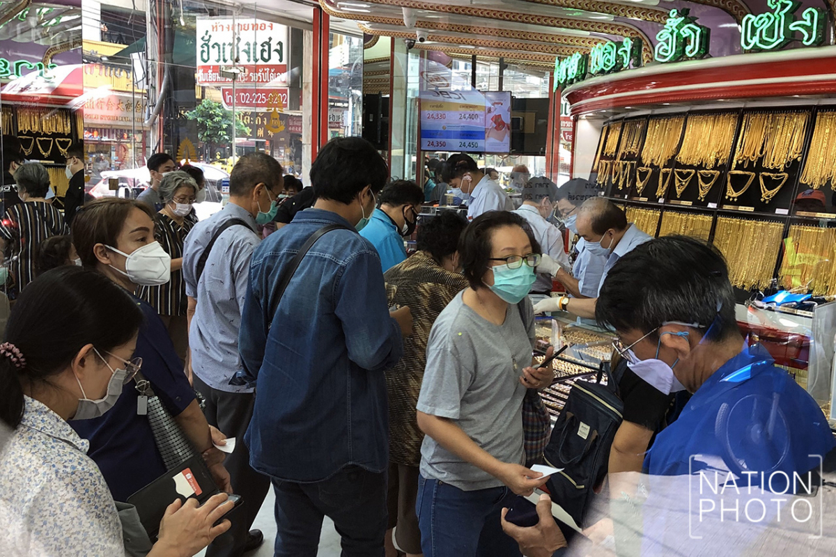 People queued at a gold shop in Bangkok’s Yaowarat area to sell their gold after the price jumped by more than Bt1,000 per baht weight this morning (March 24), compared to the price at Monday’s close.