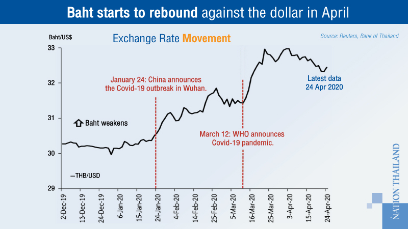 The baht and other regional currencies were hit hard in March due to a fast-rising number of confirmed Covid-19 cases. The Thai currency weakened to about Bt33 against the dollar in March, but moved into the Bt32 range in recent weeks.