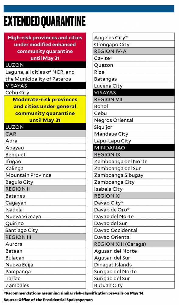 Metro Manila, Laguna province and Cebu City — ”high-risk” areas for the transmission of the coronavirus—will remain on “enhanced community quarantine,” or lockdown, which will be “modified” to allow the easing of movement and business curbs to begin a phased revival of the economy, he said.