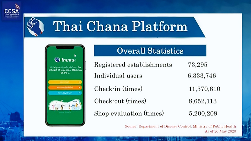 As of Wednesday 9pm, total customers checking in and checking out from ThaiChana were 11.570 million times and 8.652 million times, respectively. Besides, people rated the venues they visited through the platform 5.2 million times.